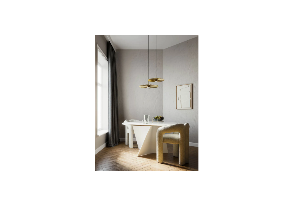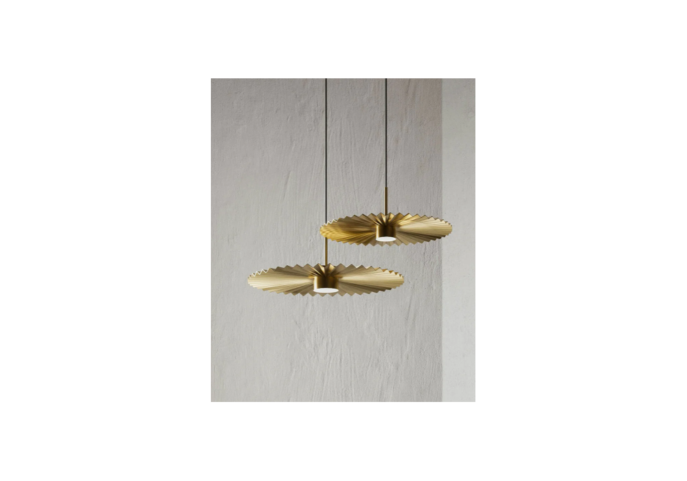 Pliè conçue par Paolo Dell'Elce pour Il Fanale est une suspension circulaire avec une surface effet plissé en laiton naturel. Le diffuseur est de forme cylindrique et adopte une source lumineuse de type LED intégrée à un système de gradation Triac. Pliè est disponible en différents modèles.