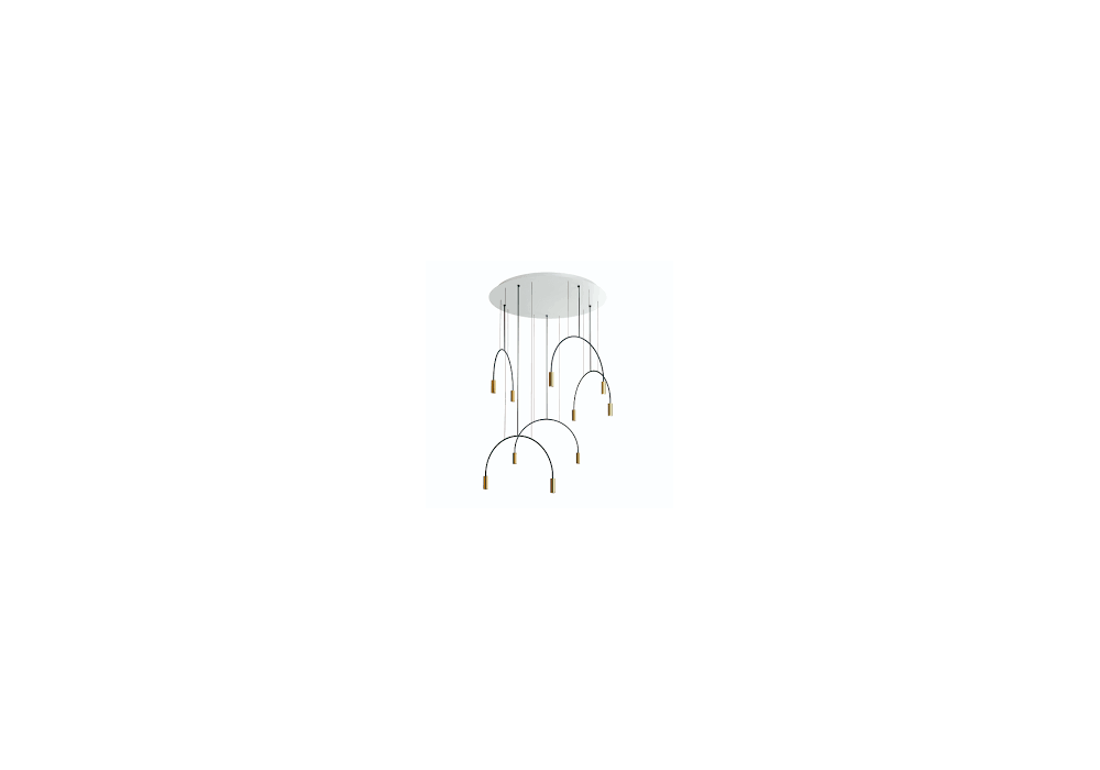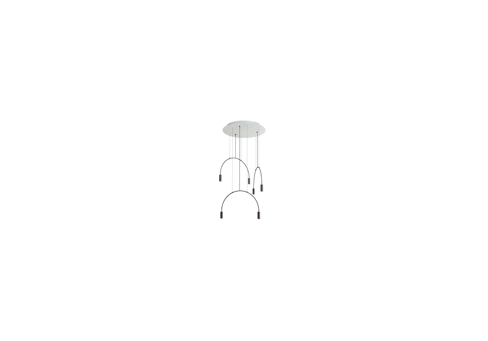 Volta conçu par Nahtrang Studio pour Estiluz est un lustre avec rosace circulaire et pendentifs avec structure arquée en aluminium peint en noir. Les abat-jour sont en aluminium cylindrique avec une lentille en PMMA qui protège une source lumineuse de type LED avec un système de gradation triac. Volta est disponible en différents modèles et finitions.