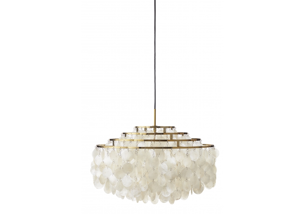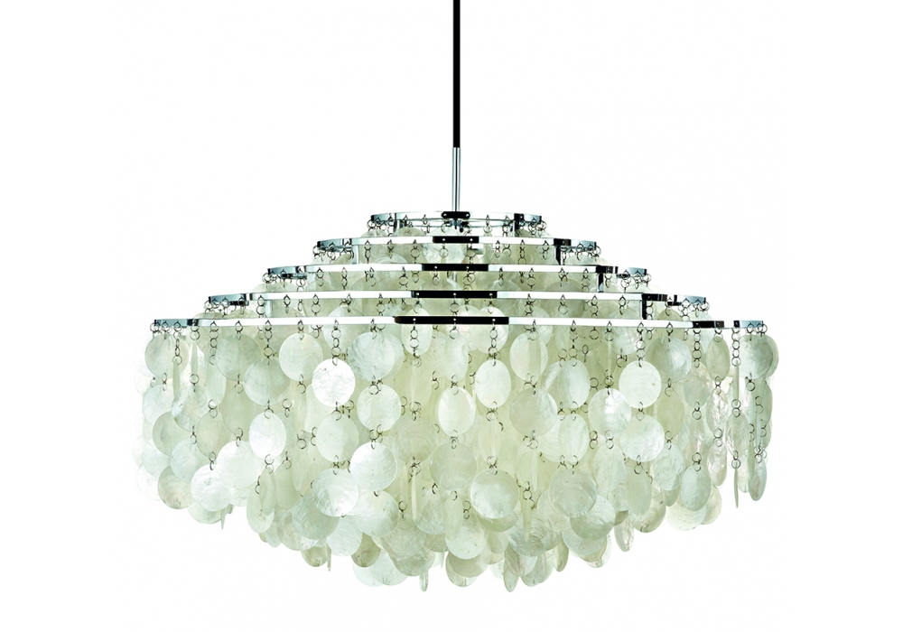 Fun conçue par Verner Panton pour Verpan est une suspension composée de disques de nacre sur une structure en métal. Les disques sont reliés les uns aux autres grâce à de petits anneaux métalliques. Rosace assortie aux disques métalliques. Disponible en différents modèles.