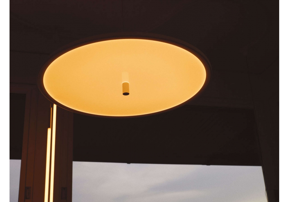 My Disc conçue par Michael Anastassiades pour Flos est une suspension à lumière diffuse composée d'un disque horizontal traversé par une tige verticale. Corps en aluminium peint blanc mat avec tige en polycarbonate. Diffuseur en PMMA sérigraphié. Source LED incluse. L'électronique intégrée au plafond permet l'utilisation de systèmes de gradation : gradation PUSH, 1-10 V, DALI.
