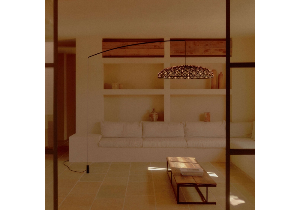 Skynest Motion conçue par Marcel Wanders Studio pour Flos est une lampe à suspension avec structure portante en aluminium peint. Le diffuseur est de forme circulaire avec un cadre recouvert de fibre textile tissée et protège une source de lumière LED dimmable. Skynest Motion est disponible en différentes finitions.
