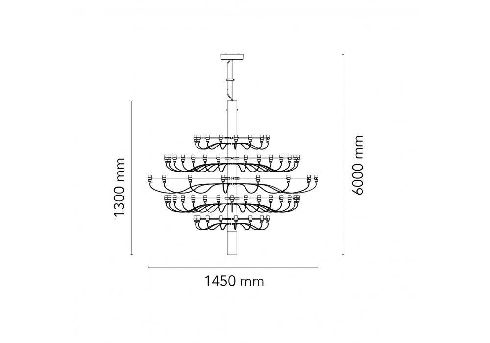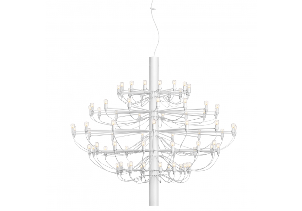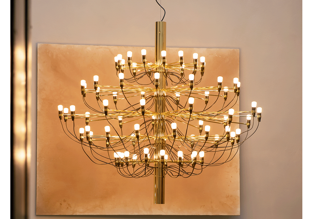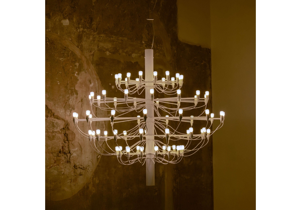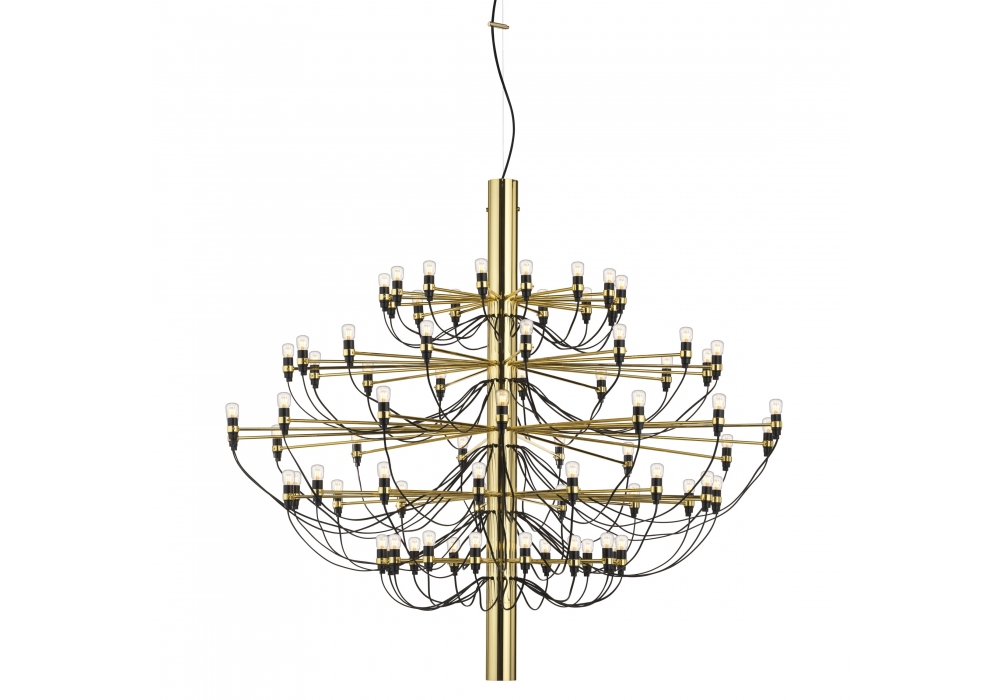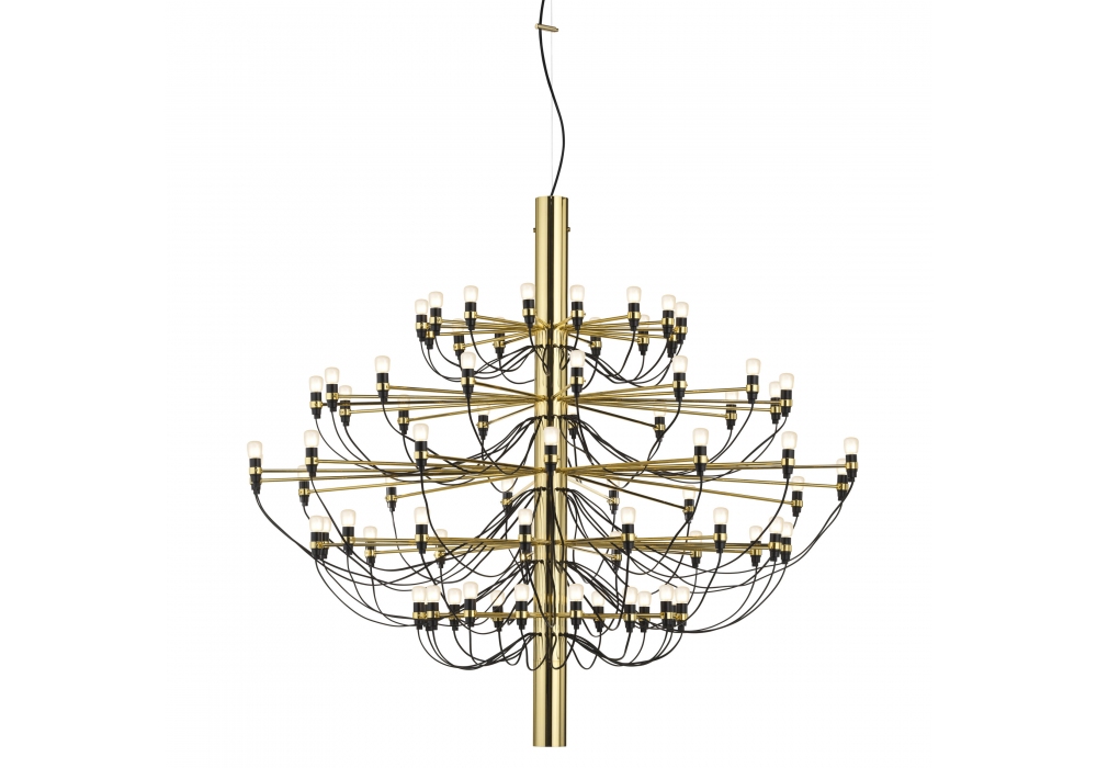 2097/75 conçue par Gino Sarfatti pour Flos est une suspension à lumière diffuse. Structure centrale en fer et bras en laiton. Fixation au plafond et rosace en acier. Télécommande (variateur non inclus). Ampoules incluses.