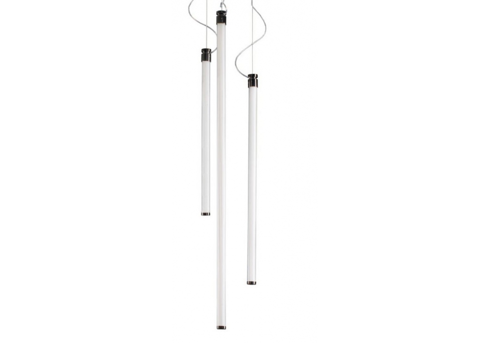 Sistema Oort conçue par Jacopo Roda pour Fontana Arte est une suspension composée d'éléments tubulaires en verre borosilicaté à l'intérieur desquels sont placés des tubes lumineux LED flexibles. Rosace pour connexion électrique décentralisée au plafond en finition blanche. Disponible en différents modèles.