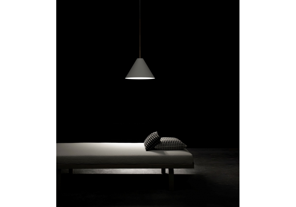 Sottosopra conçu et produit par Davide Groppi est une lampe à suspension à double émission avec tige dorée. Le diffuseur a une forme conique en métal peint et abrite une double source lumineuse LED dimmable dans différentes gradations de lumière. Sottosopra est disponible en différentes finitions.