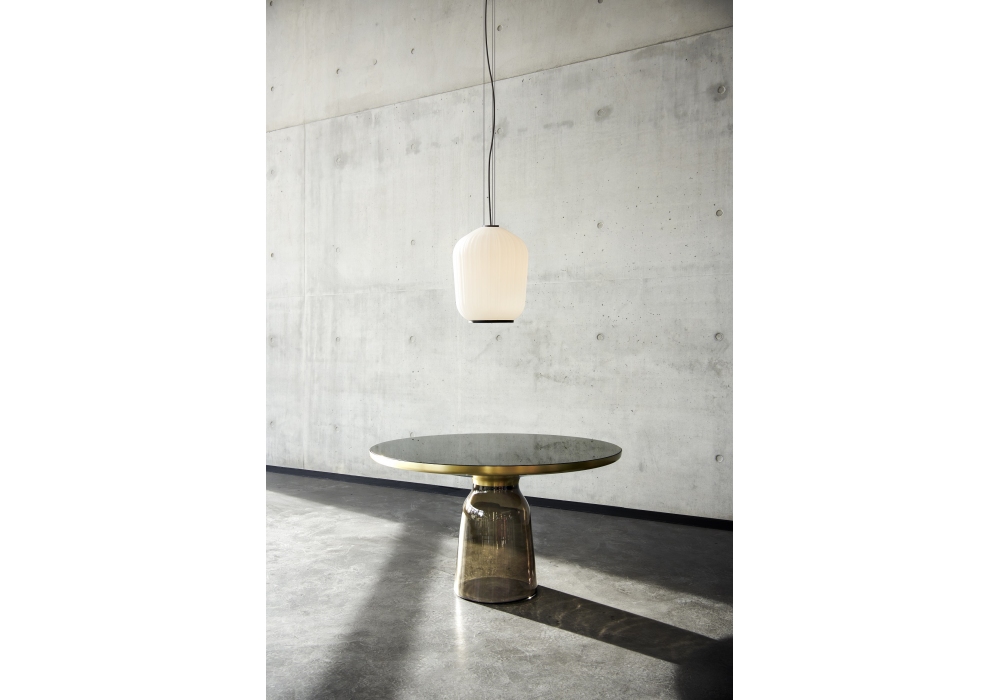 Plissée conçue par Sebastian Herkner pour ClassiCon est une suspension composée d'un anneau en aluminium. Abat-jour en verre opale satiné blanc soufflé à la main, à surface plissée.
