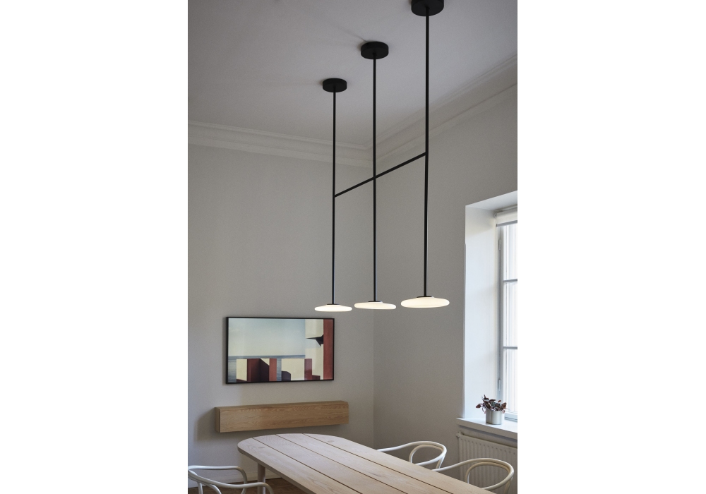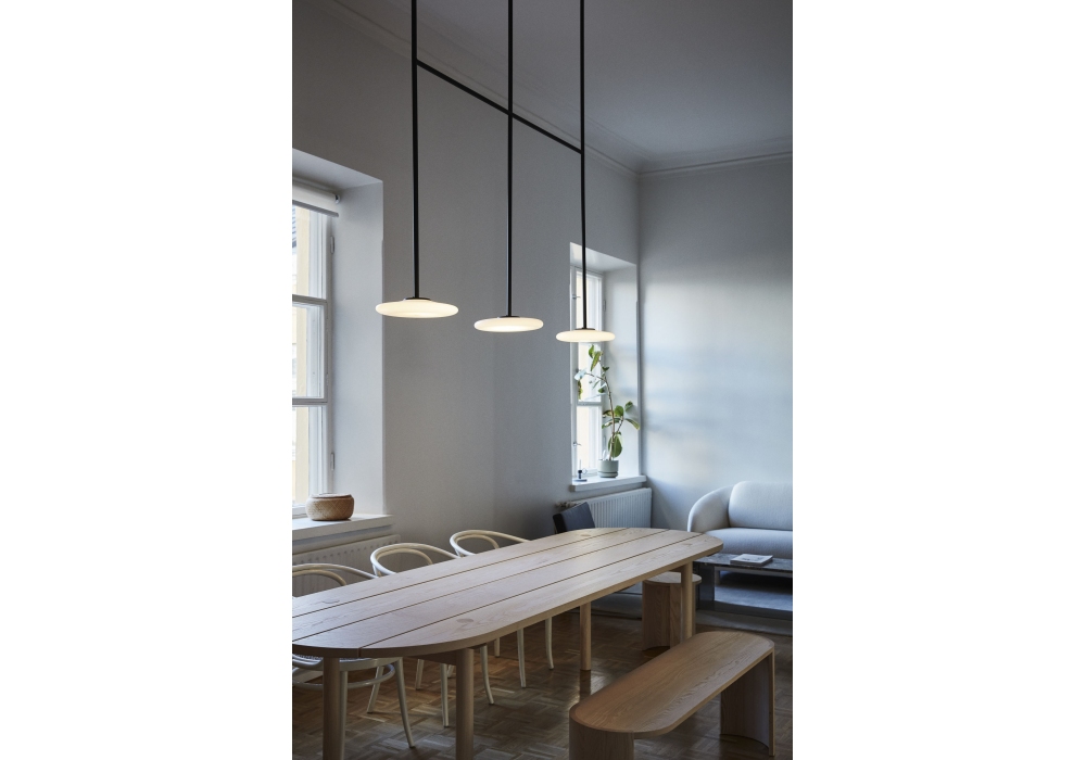 Ihana conçue par Joanna Laajisto pour Marset est une suspension / plafonnier en acier et abat-jour en verre soufflé opale. Disponible en différents modèles et tailles.