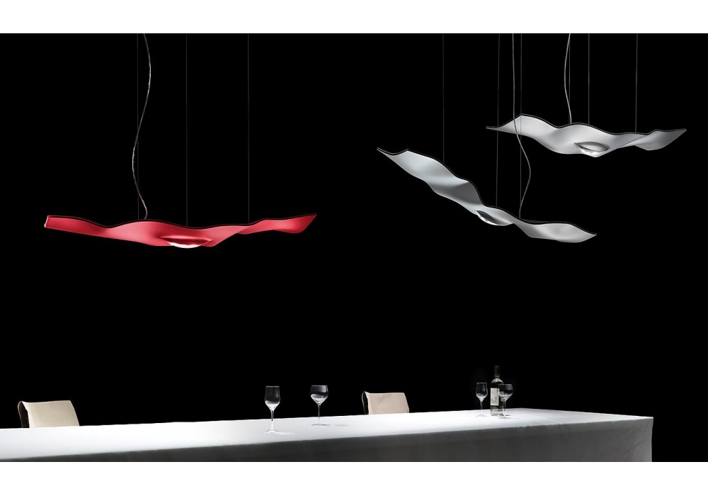 Luce Volante conçue et produite par Ingo Maurer est une lampe à suspension qui semble flotter dans l'air et produit une lumière de haute qualité. La structure est en fibre de verre et aluminium. Disponible en différentes finitions.