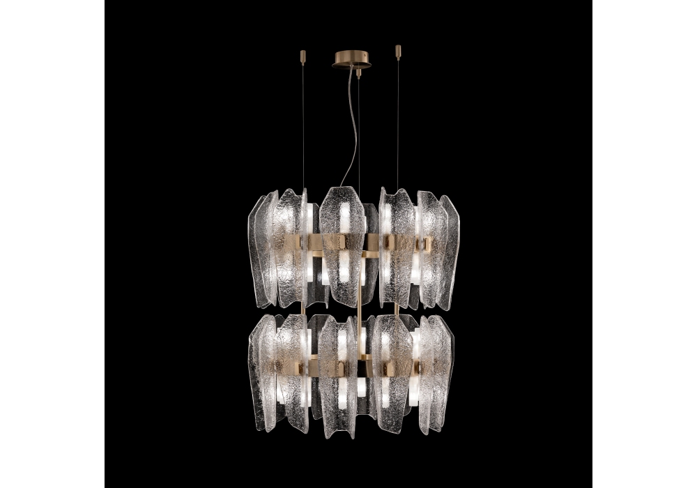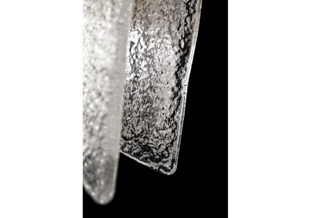 Punk conçue par Roberto Lazzeroni pour Barovier & Toso est une lampe à suspension à 1 ou plusieurs niveaux avec structure de support et détails en métal brossé nickel noir ou or brossé. Le diffuseur est composé de plusieurs applications en verre