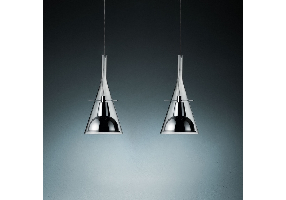 Flute 2 conçue par Franco Raggi pour Fontana Arte est une suspension, avec une structure porteuse en aluminium anodisé poli. Les diffuseurs sont en verre gainé, avec réflecteurs en aluminium poli.