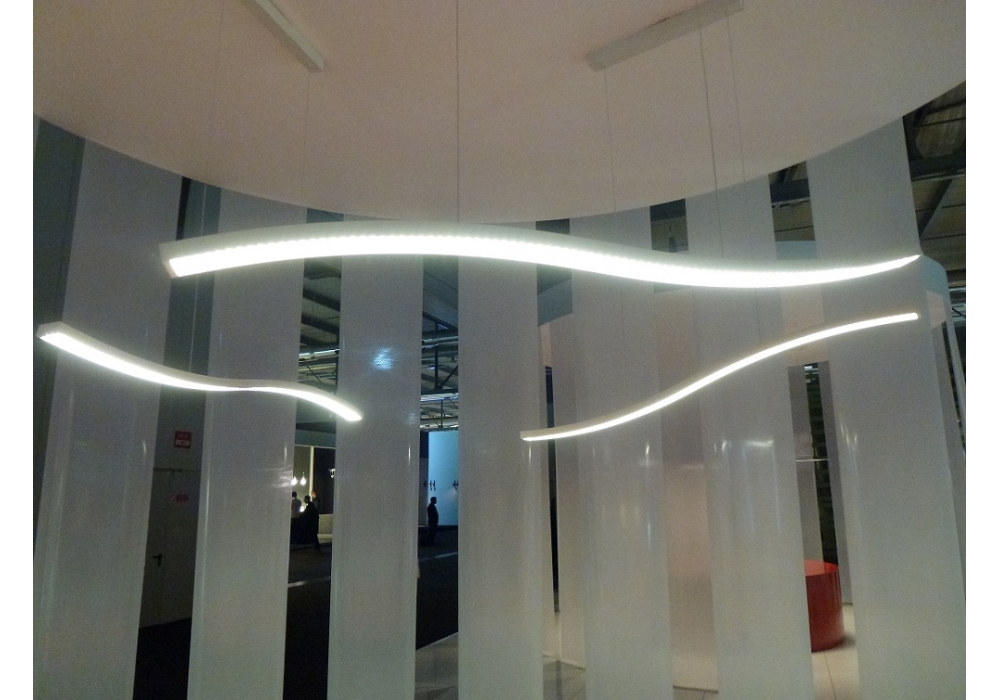 Serpentine conçue par Gabi Peretto pour Fontana Arte est une suspension à lumière directe dimmable avec structure en aluminium extrudé et courbé peint en blanc et diffuseur en méthacrylate nervuré. Câbles d'alimentation transparents. Canal en aluminium anodisé poli.