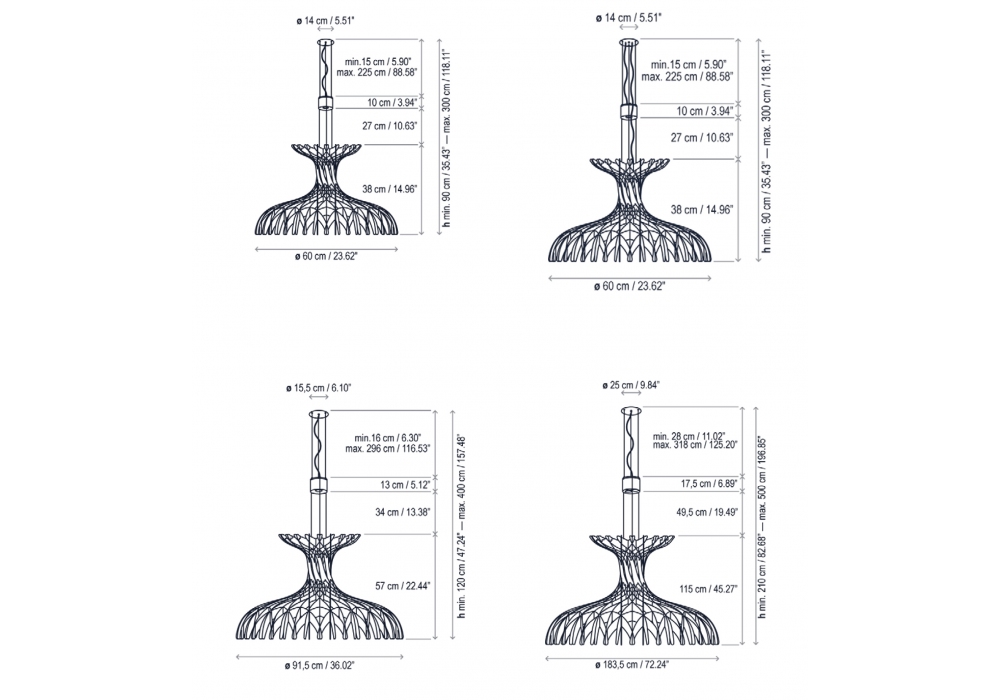 | Dimensions | Ø 60 x H 38 cm; Ø 60 x H 38 cm; Ø 91,5 x H 57 cm; Ø 183,5 x H 115 cm. |
