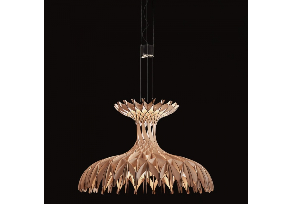 Dome conçue par Benedetta Tagliabue pour Bover est une lampe à suspension avec rosace circulaire en métal peint en blanc mat. L'abat-jour est de forme circulaire entièrement structuré en bois de hêtre naturel tressé. Le diffuseur est cylindrique en aluminium et adopte une source lumineuse de type LED avec système de gradation Triac. Dome est disponible en différents modèles.