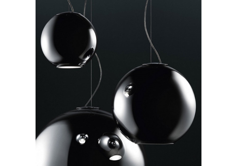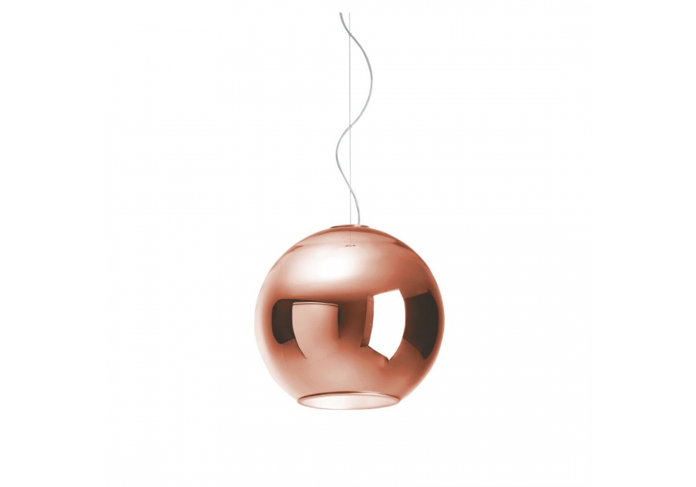 Globo Di Luce conçue par Roberto Menghi pour Fontana Arte est une suspension, avec câble de suspension en acier et corps de lampe sphérique en verre soufflé métallisé en finitions cuivre ou chrome. Le diffuseur interne est en aluminium.