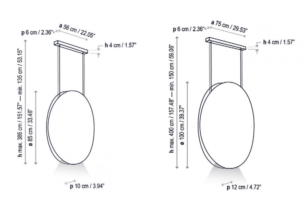 | Dimensions | Ø 85 x 10 x H 85 cm Hmax 385 cm; Ø 100 x 12 x H 100 cm Hmax 400 cm. |