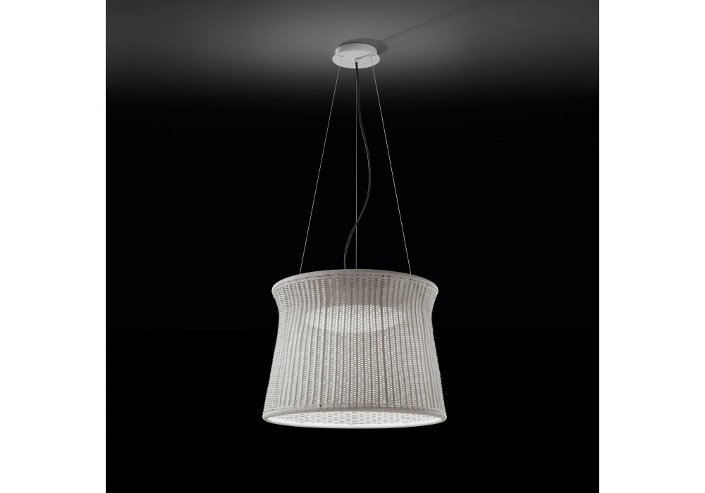 Syra conçue par Alex Fernández Camps & Gonzalo Milà pour Bover est une lampe à suspension avec rosace et structure porteuse en fer peint et aluminium. L'abat-jour est de forme circulaire en fibre synthétique polyester avec un diffuseur en verre soufflé. La source lumineuse adoptée est la LED dans la version non dimmable ou dimmable Dali. Syra est disponible en différentes finitions.