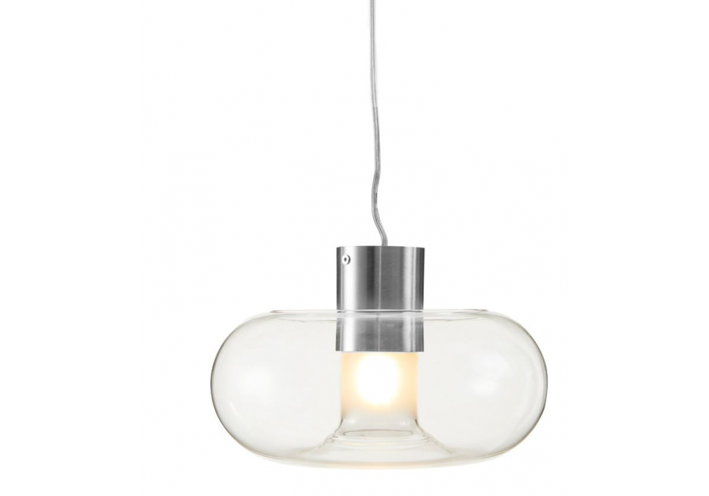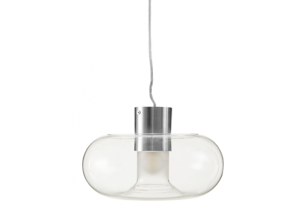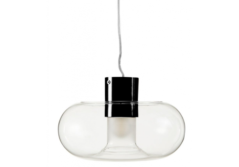 Fontanella conçue par Federico Peri pour Fontana Arte est une suspension à lumière diffuse et variable avec une structure en métal galvanisé et un diffuseur en verre borosilicaté soufflé. Câble d'alimentation transparent. Rosace de plafond en métal.