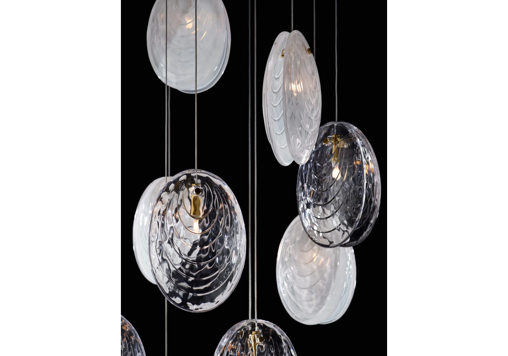 Mussels conçue par Václav Mlynář pour Bomma est une suspension avec diffuseur en verre pressé peint à la main et monture en métal. Il est disponible en différentes finitions.