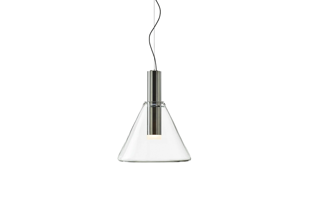Phenomena Cone conçue par Dechem Studio pour Bomma est une suspension avec abat-jour en cristal soufflé bouche et diffuseur en métal. Il est disponible en différentes finitions.