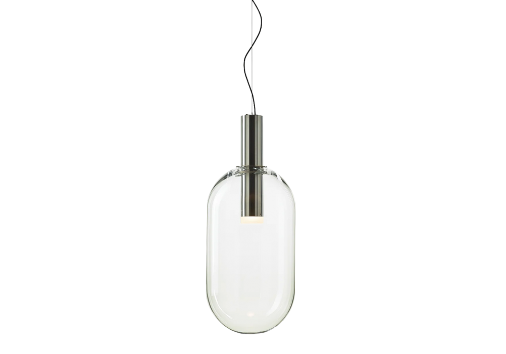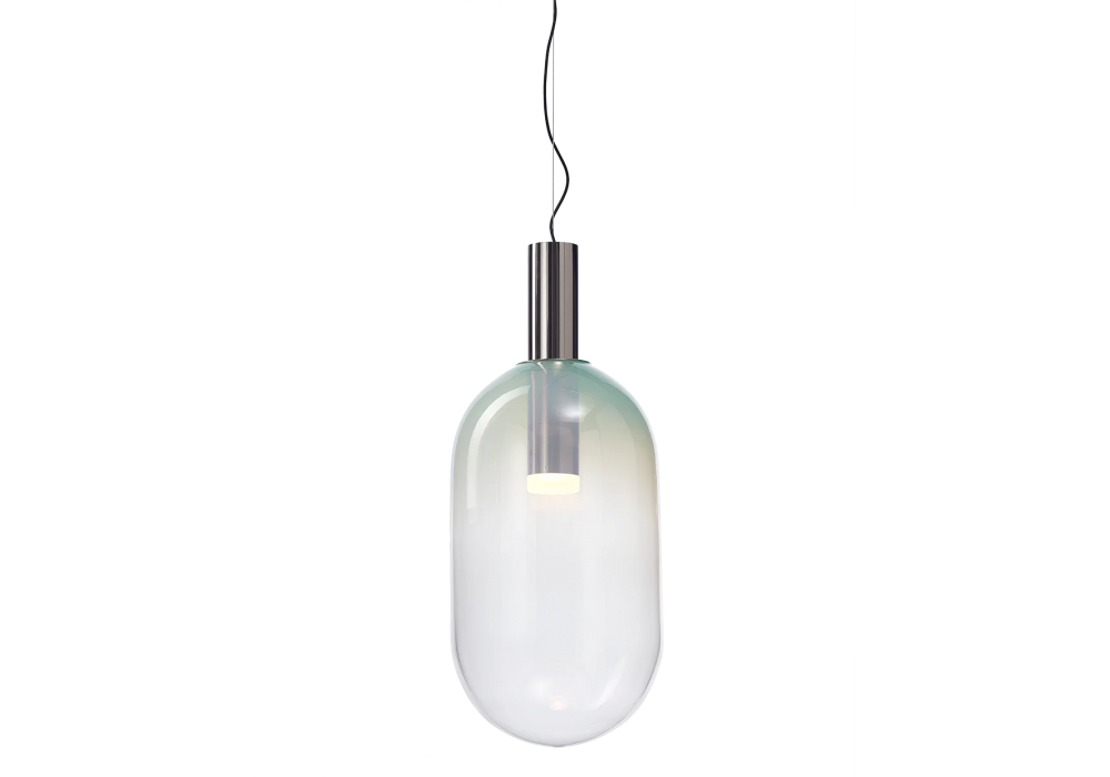 Phenomena Capsule conçue par Dechem Studio pour Bomma est une suspension avec abat-jour en cristal soufflé bouche et diffuseur en métal. Il est disponible en différentes finitions.