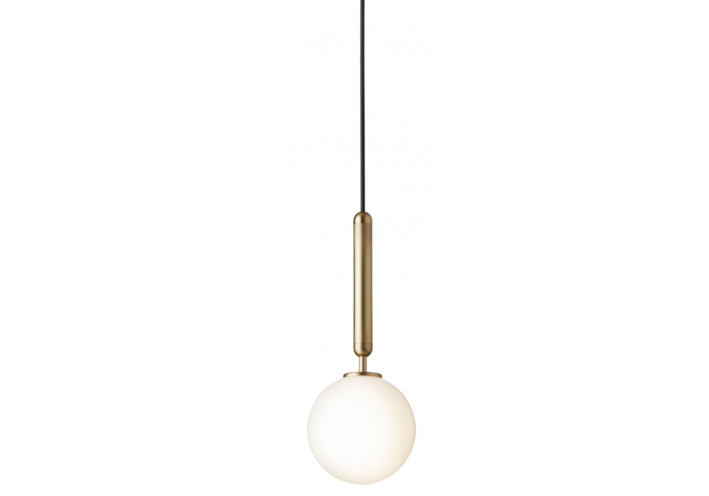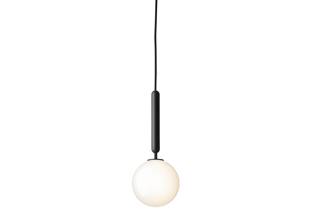 Miira conçue par Sofie Refer pour Nuura est une suspension avec structure en métal travaillé et diffuseur en verre opale soufflé bouche ou transparent avec motif en relief.