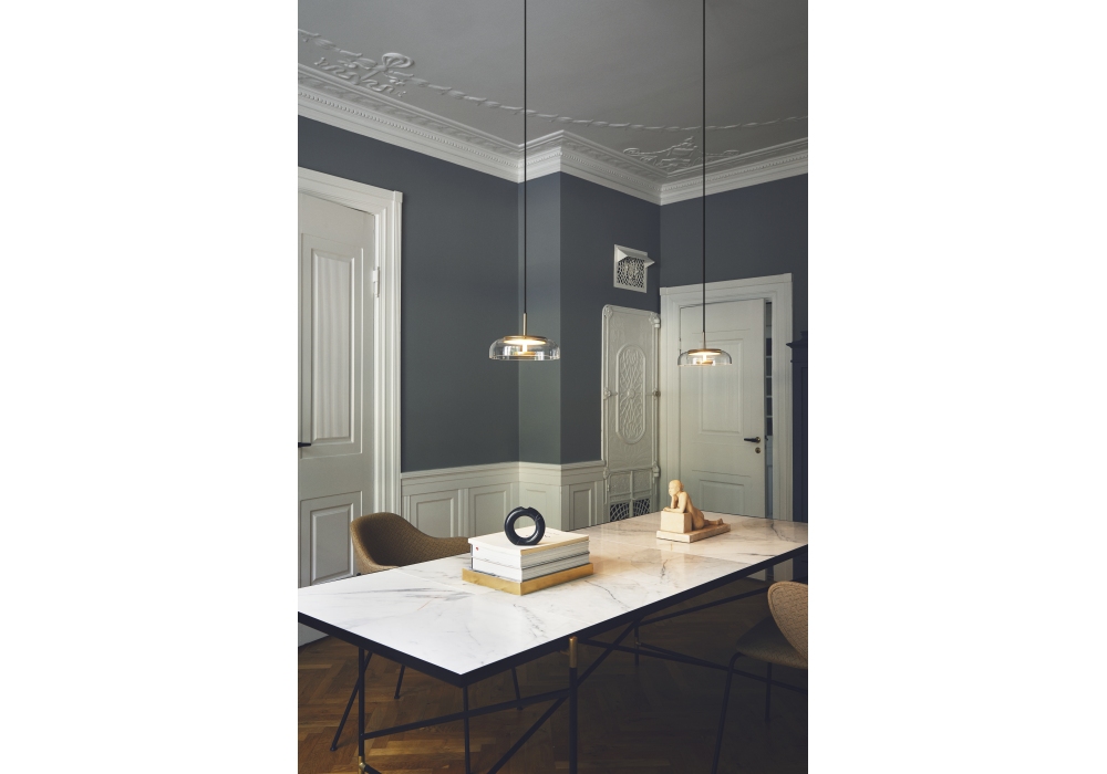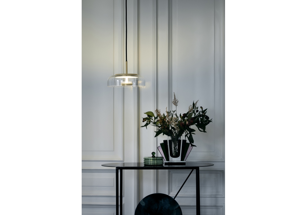 Blossi conçue par Sofie Refer pour Nuura est une suspension réalisée avec un abat-jour arrondi en verre soufflé transparent et des détails en métal doré nordique. Disque LED intégré.