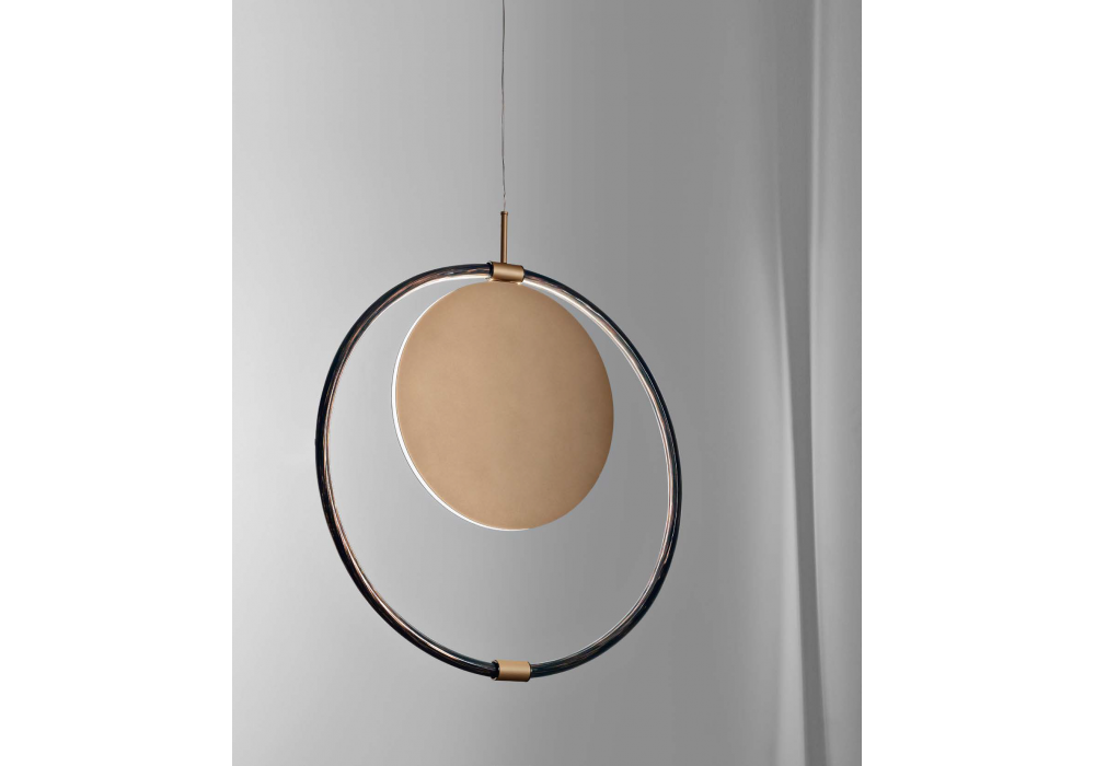 Enso conçue par Roberta Vitadello et Stefano Traverso pour Italamp est une suspension composée d'un cercle tubulaire en verre artistique noir avec pigment aventurine. Le disque interne est en métal avec une finition champagne mate.