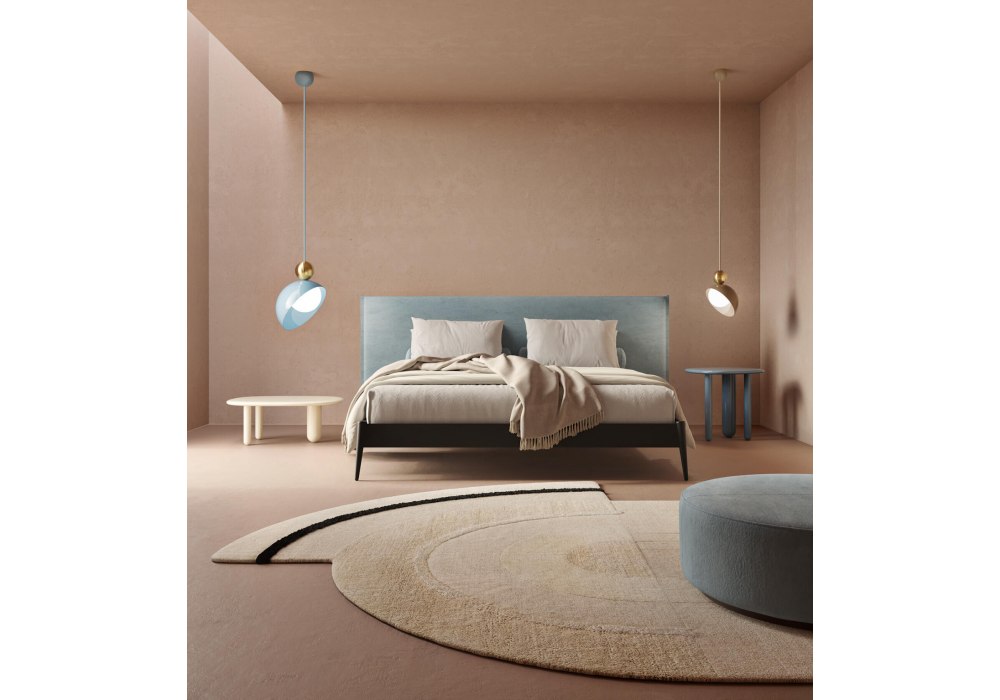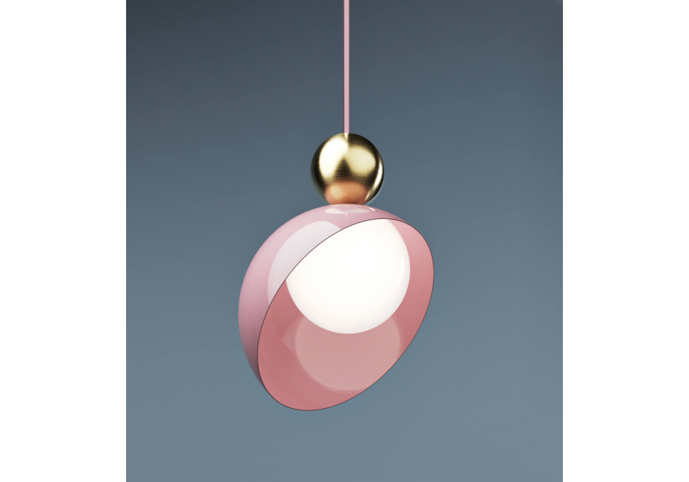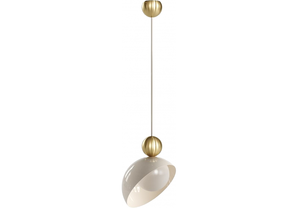 Aurora conçue par Virginia Cei pour Italamp est une suspension réalisée en métal peint et sphère centrale en finition or clair brossé. Le diffuseur est en verre blanc.
