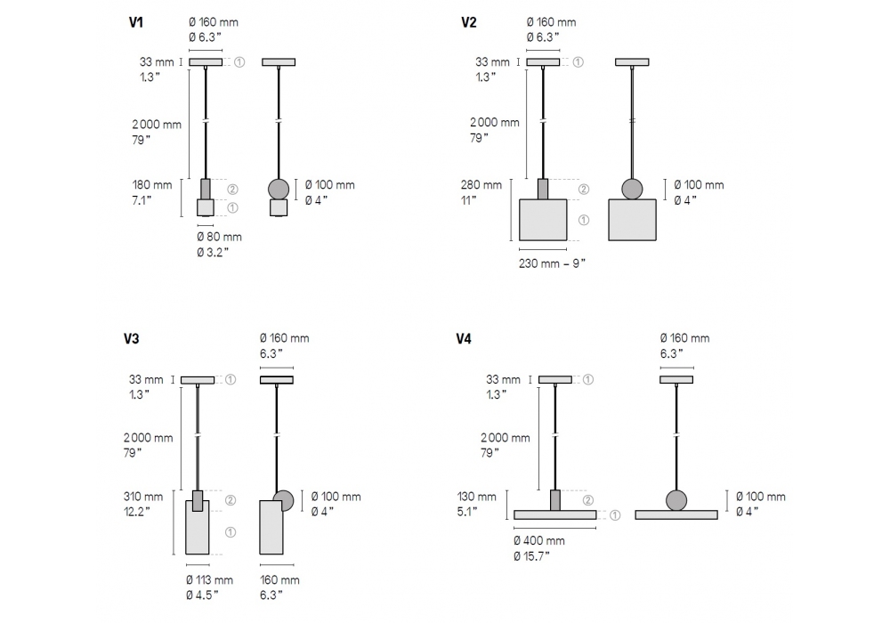 | Dimensions | V1_ Ø 8 x H 18 cm; V2_ Ø 23 x H 28 cm; V3_ 11.3 x 16 x H 31 cm; V4_ Ø 40 x H 13 cm. |