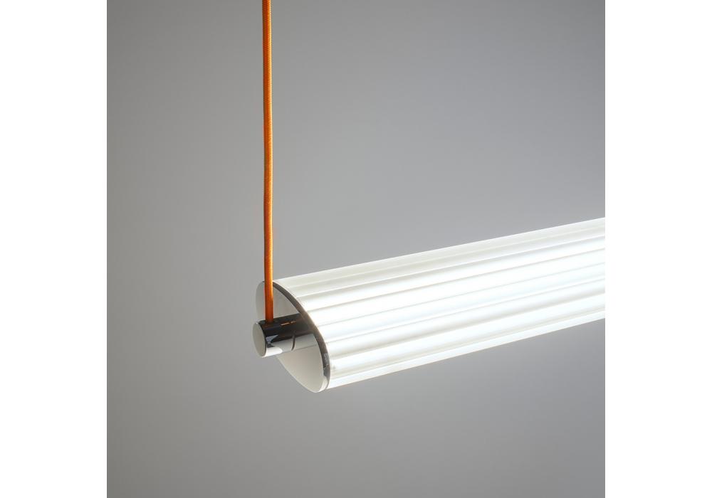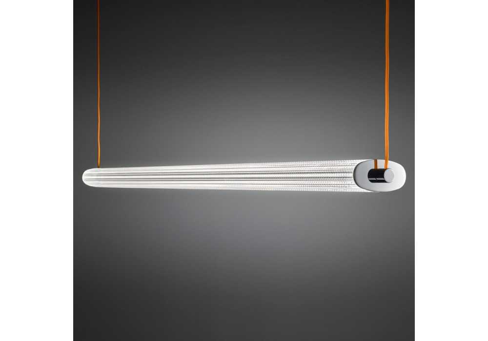 ex–Tr conçue par Franco Raggi pour Firmamento Milano est une suspension à lumière diffuse réalisée en acier chromé et verre canulé extrudé. Câble en tissu orange. Disponible en différentes finitions et dimensions.