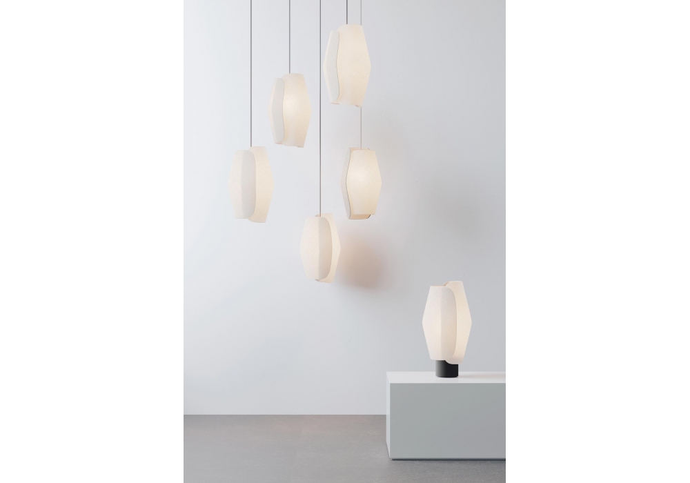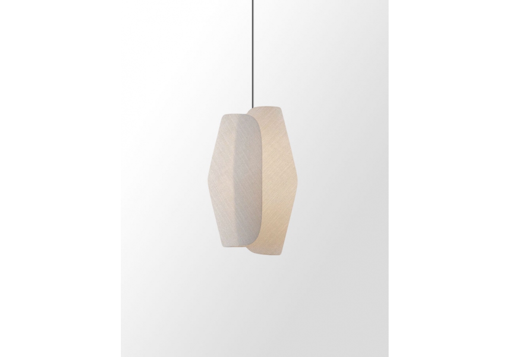 Volute conçue par Sebastian Herkner pour Rakumba est une lampe à suspension réalisée en tissu, disponible en différentes finitions.