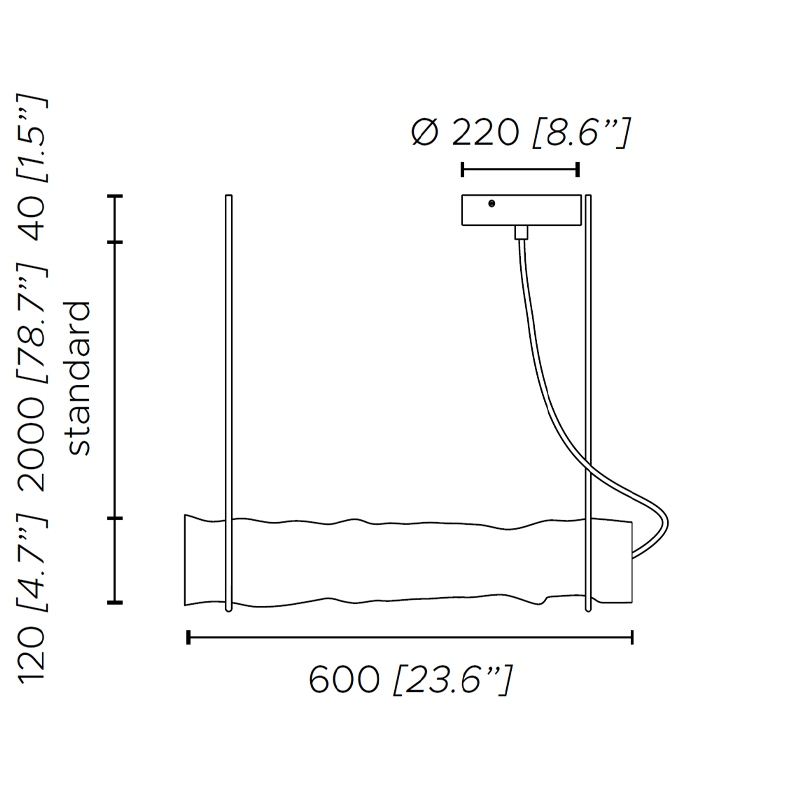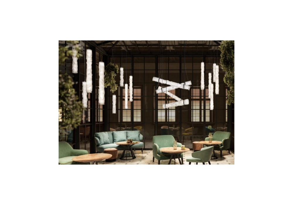 Baggy Horizontal conçue par Paola Navone pour Contardi est une lampe à suspension avec un corps cylindrique irrégulier en polycarbonate bi-satiné et un cordon de suspension en tissu blanc et gris. La source lumineuse est de type Strip LED avec système de gradation. Baggy Horizontal est disponible en différents modèles, longueurs de cordon de suspension et versions dimmables.