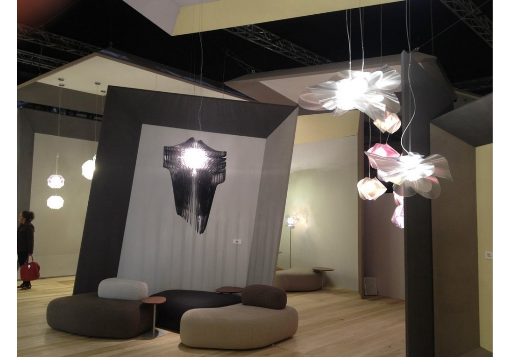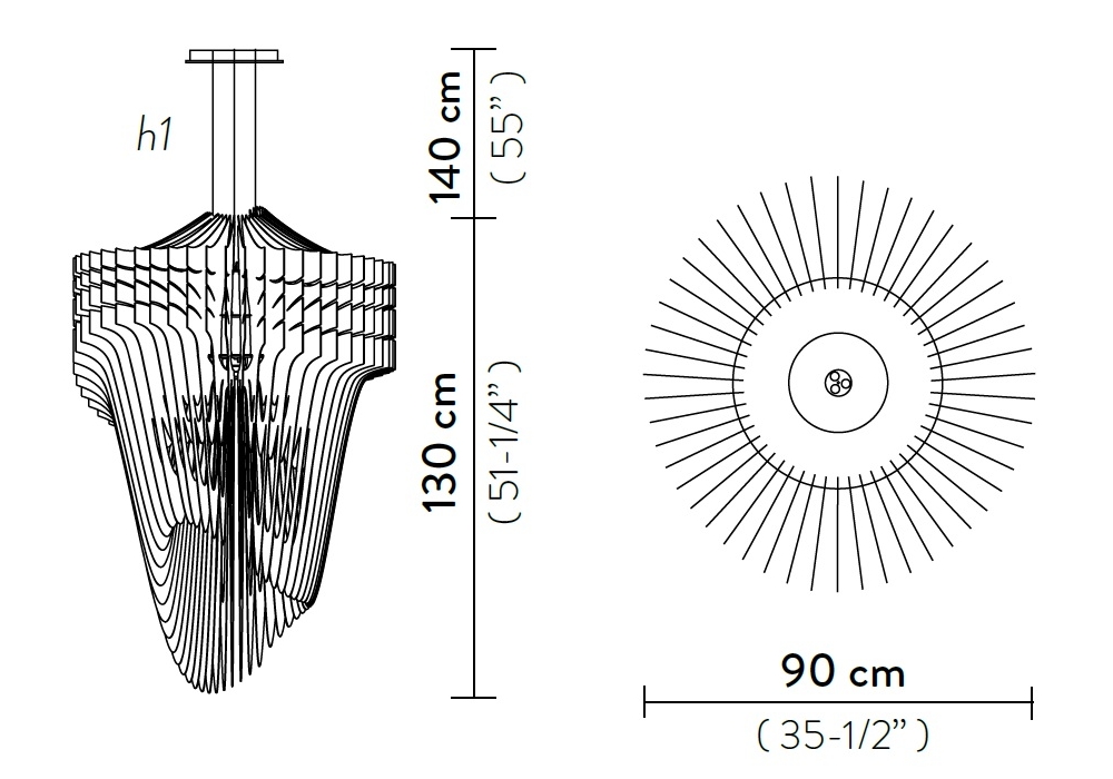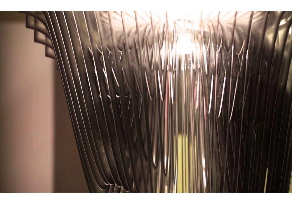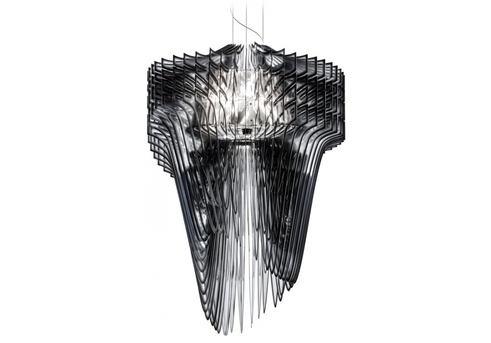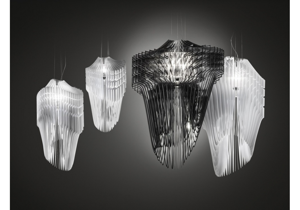 Aria conçue par Zaha Hadid pour Slamp est une lampe à suspension circulaire avec structure de support en métal. Le diffuseur est enrichi par divers éléments en Cristalflex®/Lentiflex® noir dégradé et des sources lumineuses à LED dimmables sur l'écran.