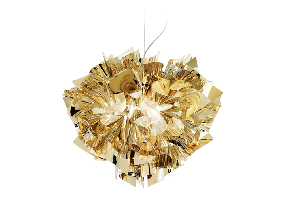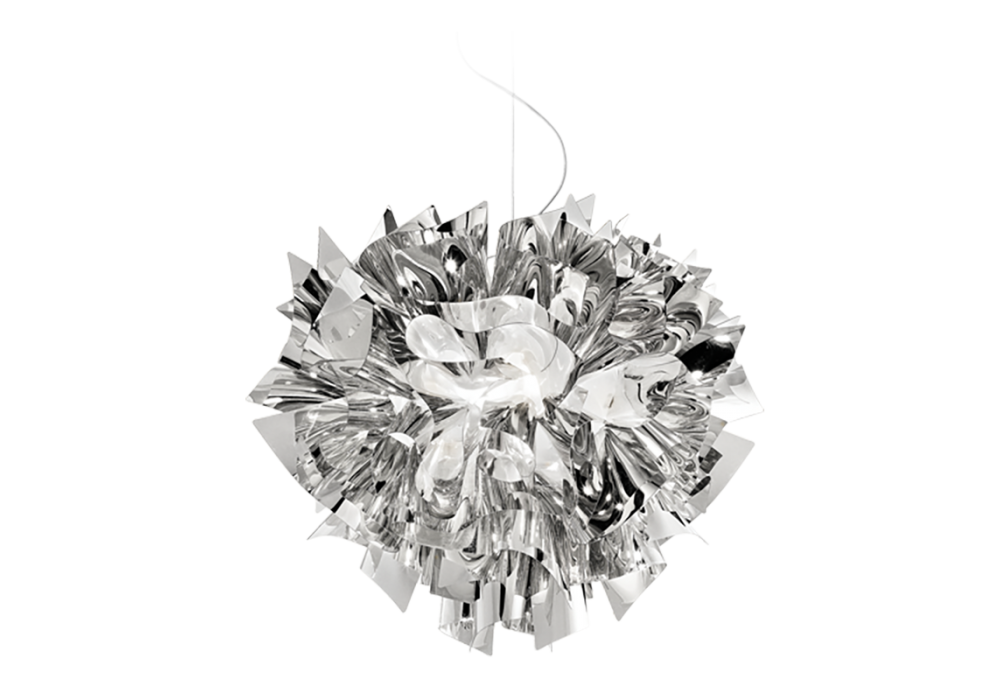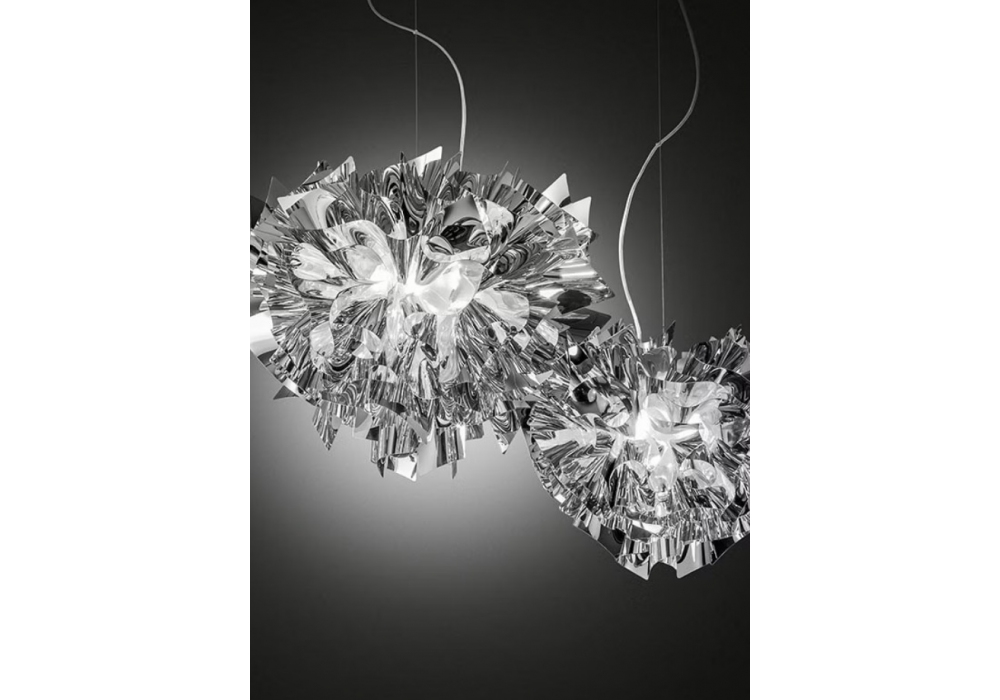 Veli conçue par Adriano Rachele pour Slamp est une suspension avec une forme abstraite réalisée en combinant Opalflex®, Lentiflex®, Goldflex®, Steelflex® , Copperflex®. Veli est disponible en différentes tailles. La source lumineuse adoptée est avec une douille E27 de type LED à filament dimmable. Veli est disponible en différentes finitions.