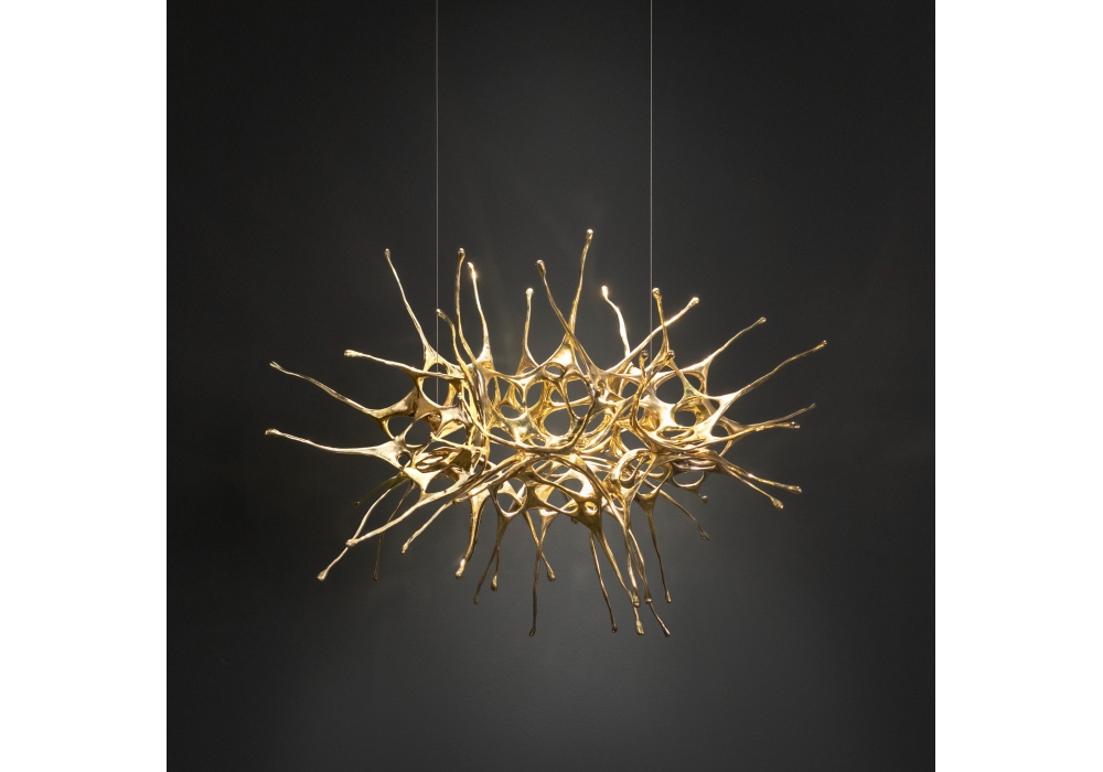 Dragon Oval conçue par Dodo Arslan pour Terzani est une lampe à suspension entièrement structurée en laiton avec une forme abstraite soutenue par des câbles en acier. Les sources lumineuses sont de type LED orientables, dimmables ou non. Dragon Oval est disponible avec un système d'éclairage encastré ou au plafond.