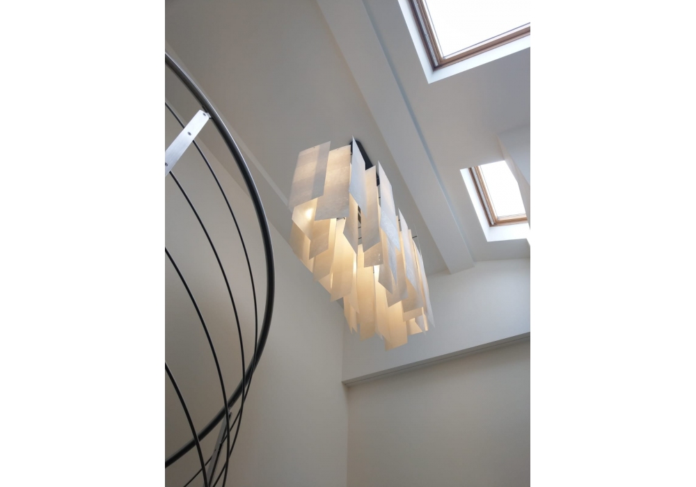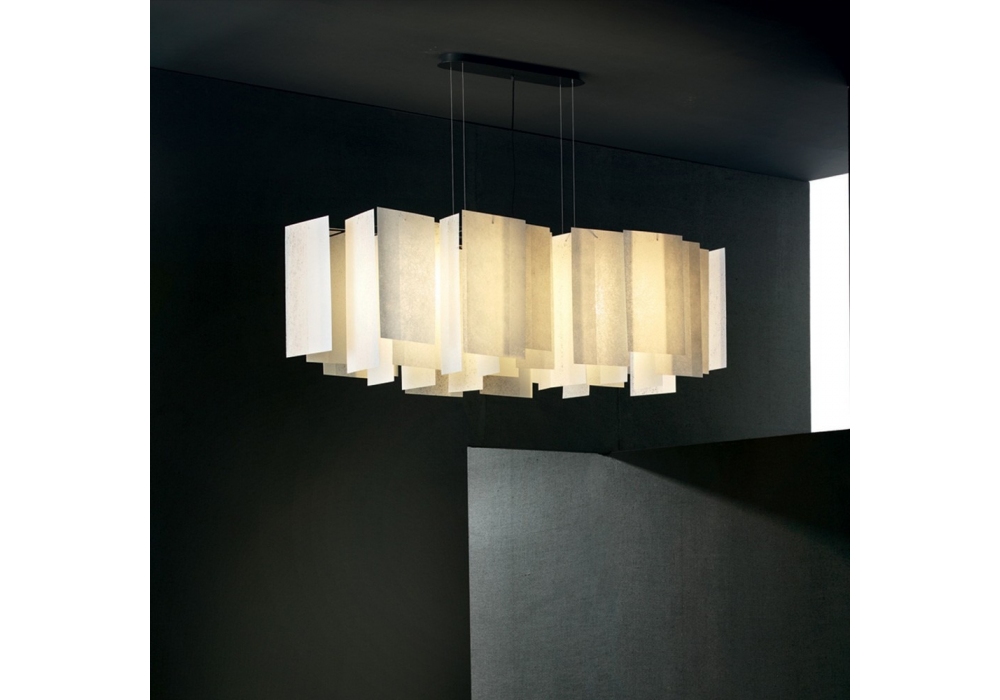 Alexandra Long conçue par Enrico Franzolini pour Pallucco est une lampe à suspension entièrement réalisée à partir de la combinaison de fibre de verre et de métal peint en gris. Le diffuseur est structuré par différentes feuilles superposées de fibre de verre blanc ivoire qui protègent les sources lumineuses avec douille E27. Alexandra Long est disponible en différents modèles.