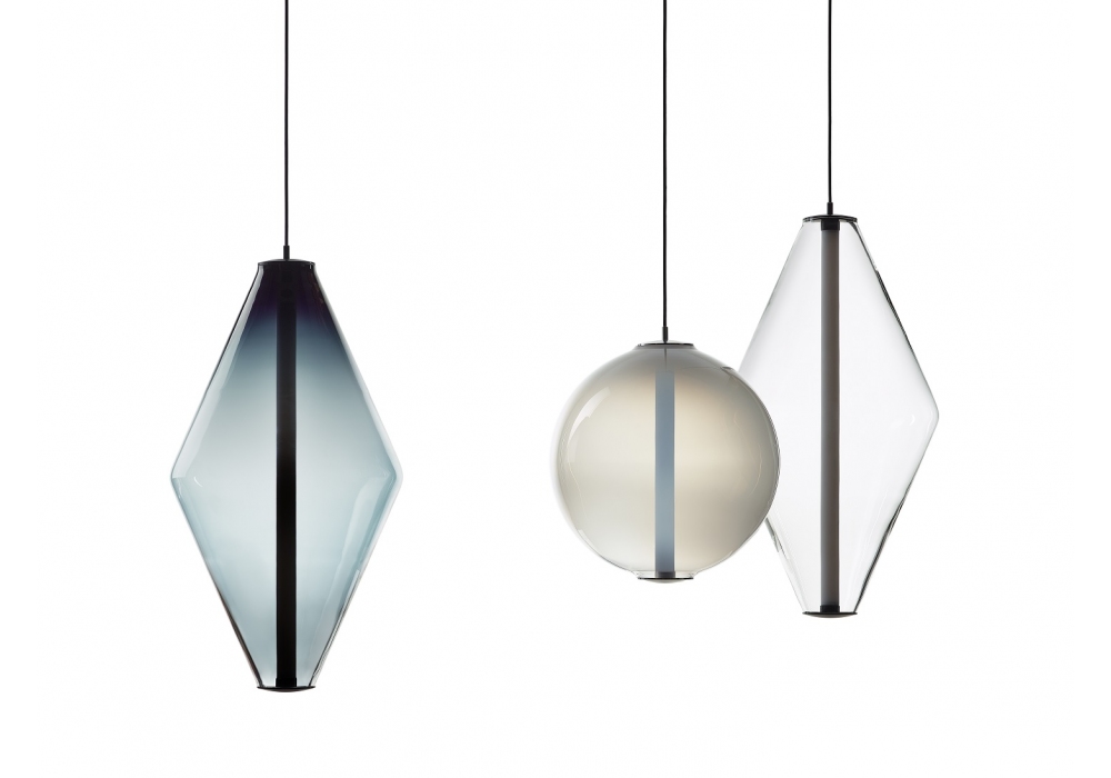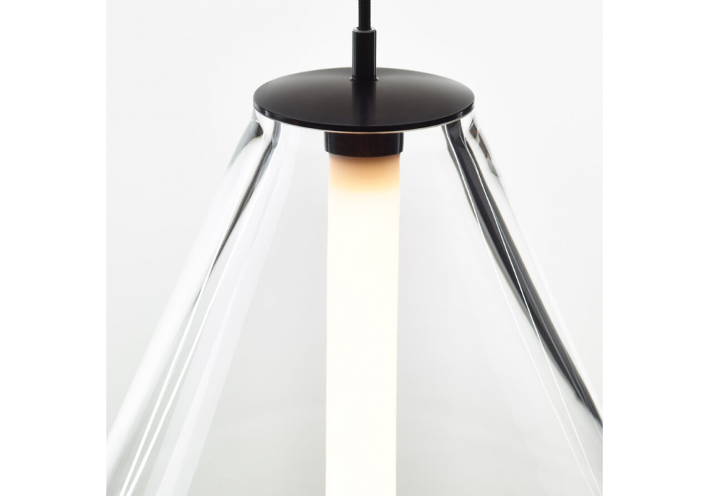Buoy Double Cone conçue par Václav Mlynář pour Bomma est une suspension avec un diffuseur en cristal soufflé à la bouche et un détail en aluminium noir ou argent. Disponible en différentes finitions.
