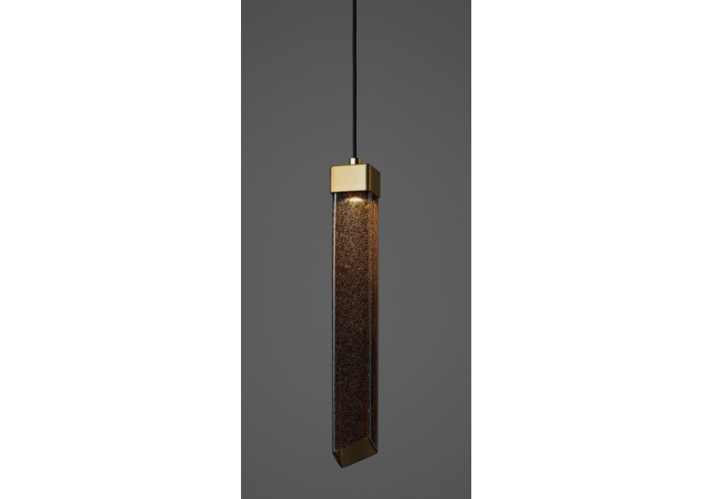 Comet conçue par Simona Sbordone pour Brokis est une suspension en verre feuilleté soufflé à la main, avec des grains de sable de silice insérés entre les couches. Corps de lampe et rosace en métal. La lampe utilise une source LED à intensité variable.