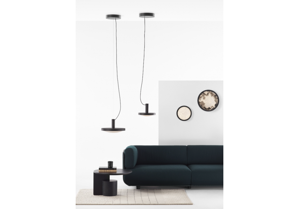Convex conçue par Boris Klimek pour Brokis est une suspension en verre dotée d'une finition brillante ou acidulée. Son corps est en métal thermolaqué noir mat structuré, avec une rosace assortie. Câble textile noir.