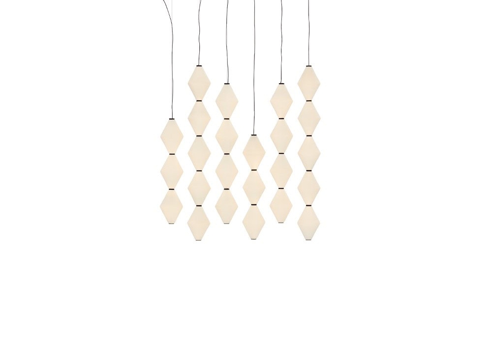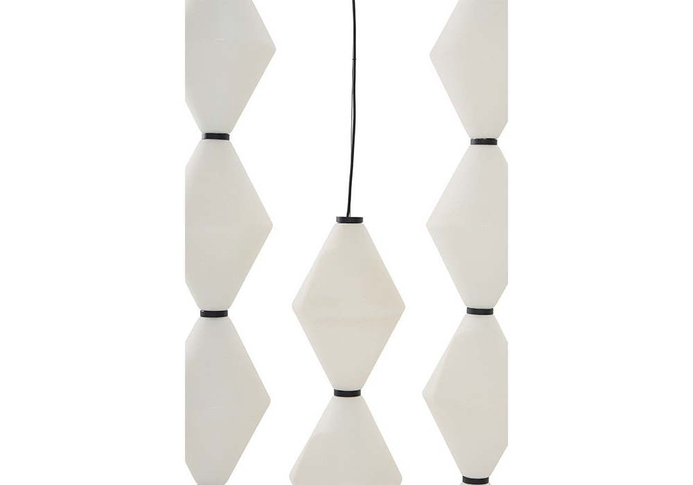 Helium Mini conçue par Elisa Ossino pour DePadova est une suspension réalisée avec une structure en métal thermolaqué noir mat « soft touch ». Diffuseur en verre Triplex opale soufflé bouche, gravé à l'acide ; ou en verre effet sable décoré à la main. Alimentation et variateur intégrés à la rosace.
