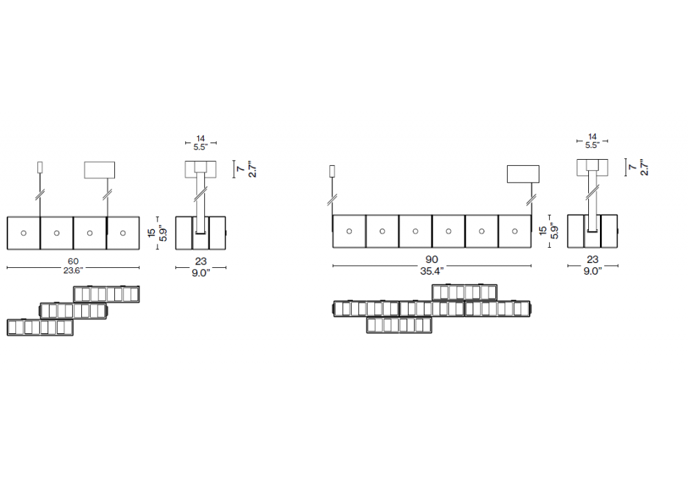 | Dimensions | 60 x 23 x H 15 cm - 37W; 90 x 23 x H 15 cm - 65W. |