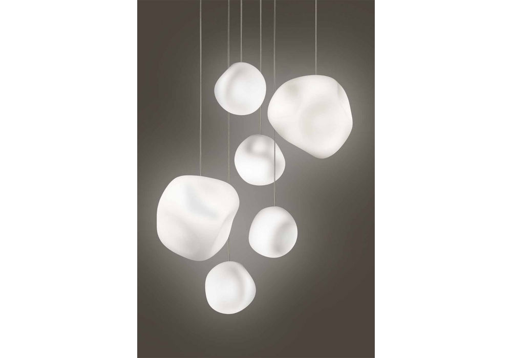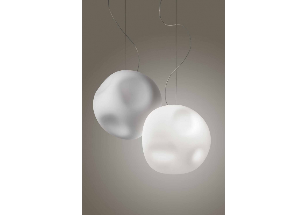 Hoba conçue par Ludovica et Roberto Palomba pour Foscarini est un suspension inspirée de la forme d'une météorite, asymétrique en verre soufflé opaque. Disponible en différentes dimensions.