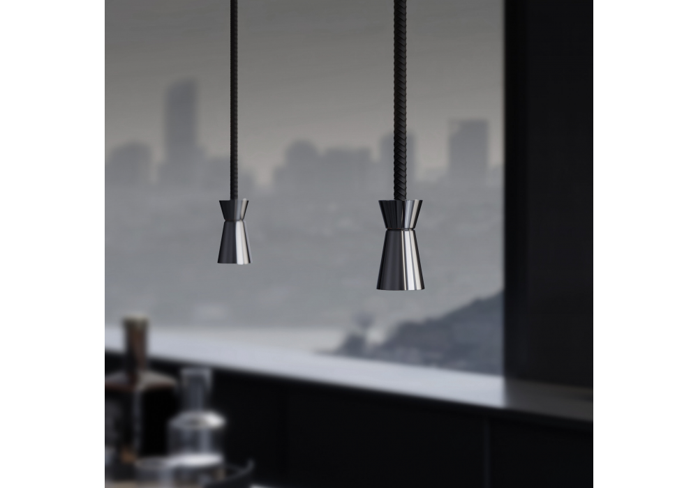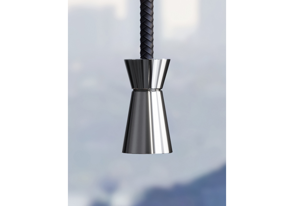 G+T conçue par Jan Van Lierde pour Contardi est une suspension dont la structure et le diffuseur sont en métal et en cuir tressé brun foncé.