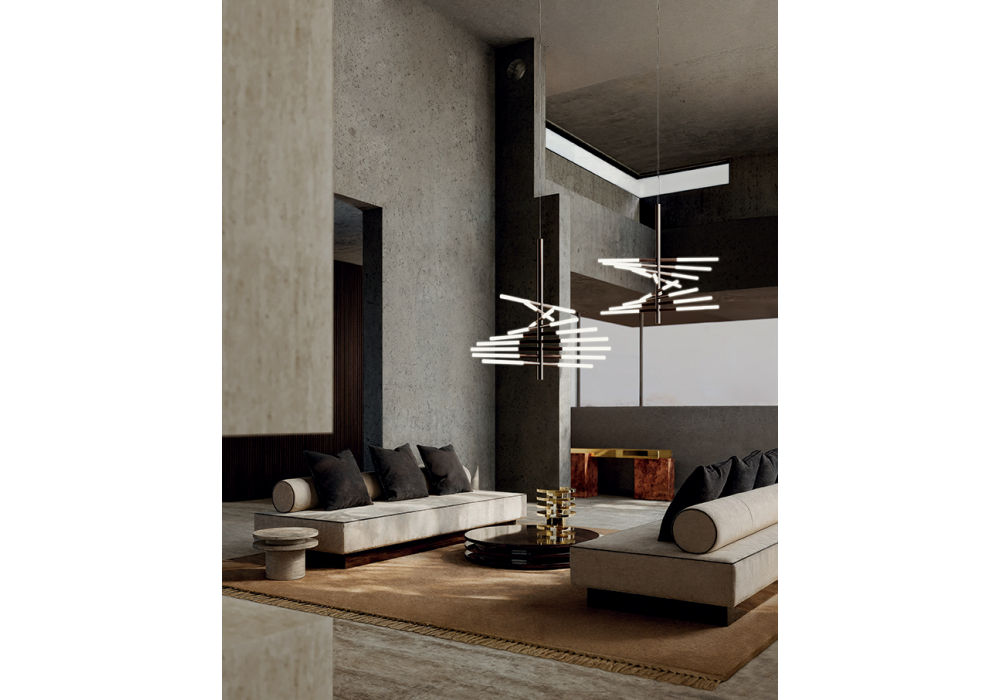 Bianca Twist conçue par Dainelli Studio pour Contardi est une suspension dotée de bras lumineux disponibles en finition or ou bronze. Sa structure modulaire est composée d'éléments reliés par simple contact, sans câbles, qui transmettent l'électricité via des circuits intégrés. La version Twist présente une configuration hélicoïdale qui accentue la légèreté et le mouvement. Équipée de sources LED sur mesure à lumière chaude (2700 K), elle est dimmable et compatible avec divers systèmes de commande.