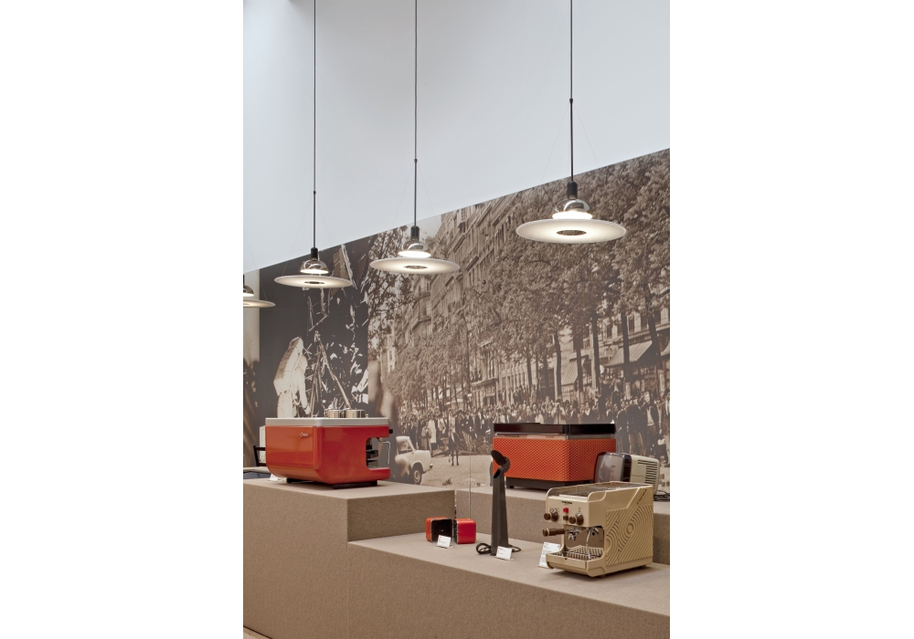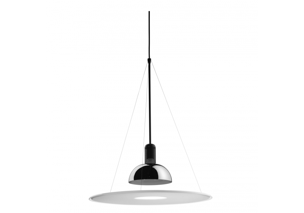 Frisbi conçue par Achille Castiglioni pour Flos est une suspension à lumière directe, diffuse et réfléchie. Plaque diffuseur en polyméthacrylate de méthyle (PMMA) opalin moulé par injection, fixée au corps de l'appareil par trois fins fils d'acier harmonique. Réflecteur en tôle emboutie, polie, nickelée, zaponisée, peinte en blanc brillant à l'intérieur. Fixation murale et rosace en ABS noir moulé par injection. Orientable à distance (variateur non inclus). Ampoule non incluse.