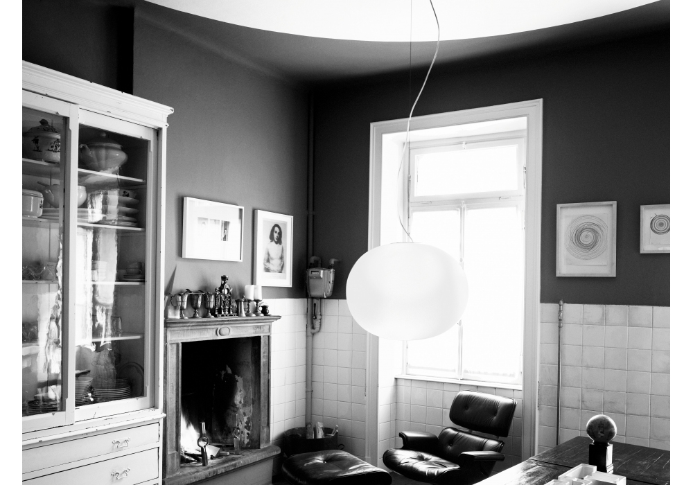Glo-Ball S2 conçue par Jasper Morrison pour Flos est une suspension à lumière diffuse. Diffuseur en verre opalin soufflé bouche, avec finition extérieure gravée à l'acide. Support en polycarbonate transparent moulé par injection. Rosace en polyamide chargé à 30 % de fibre de verre, moulée par injection, et fixation au plafond en acier moulé et galvanisé. Câble de suspension en acier. Réglable à distance (variateur non inclus). Ampoule non incluse.