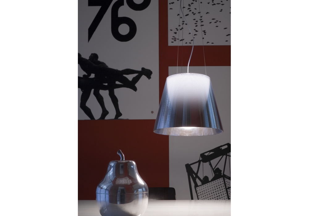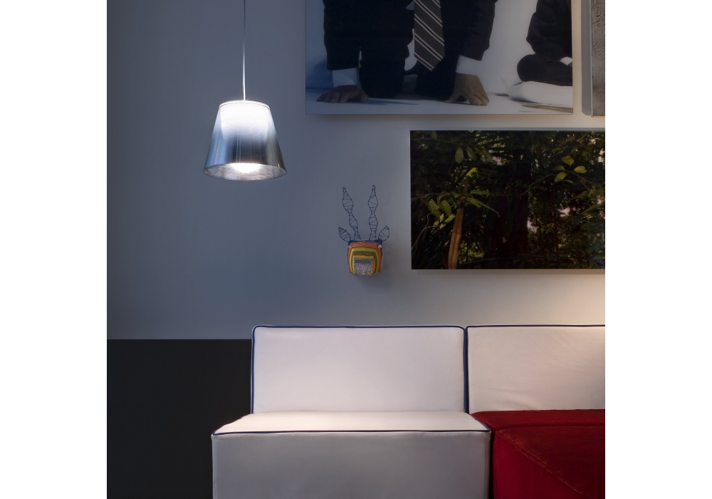 KTribe S2 conçue par Philippe Starck pour Flos est une suspension à lumière diffuse. Son diffuseur interne est en polycarbonate (PC) finition blanc mat. Les diffuseurs externes sont disponibles en versions transparente ou fumée, en PMMA (polyméthacrylate de méthyle) et bronze métallisé sur la surface interne par un procédé d'aluminium sous vide. Rosace blanche. Ampoule non incluse.