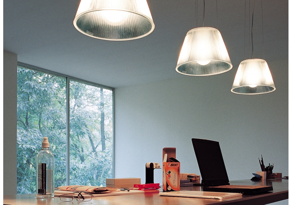 Romeo Moon S1 conçue par Philippe Starck pour Flos est une suspension à lumière diffuse. Diffuseur interne en verre borosilicate pressé avec finition dépolie à l'acide. Diffuseur externe en verre transparent pressé. Support du diffuseur en polycarbonate transparent moulé par injection. Pare-poussière en polycarbonate transparent découpé. Rosace en ABS blanc moulé par injection et fixation au plafond en acier embouti et galvanisé. Câbles de suspension en acier. Réglable à distance (variateur non inclus). Ampoule non incluse.