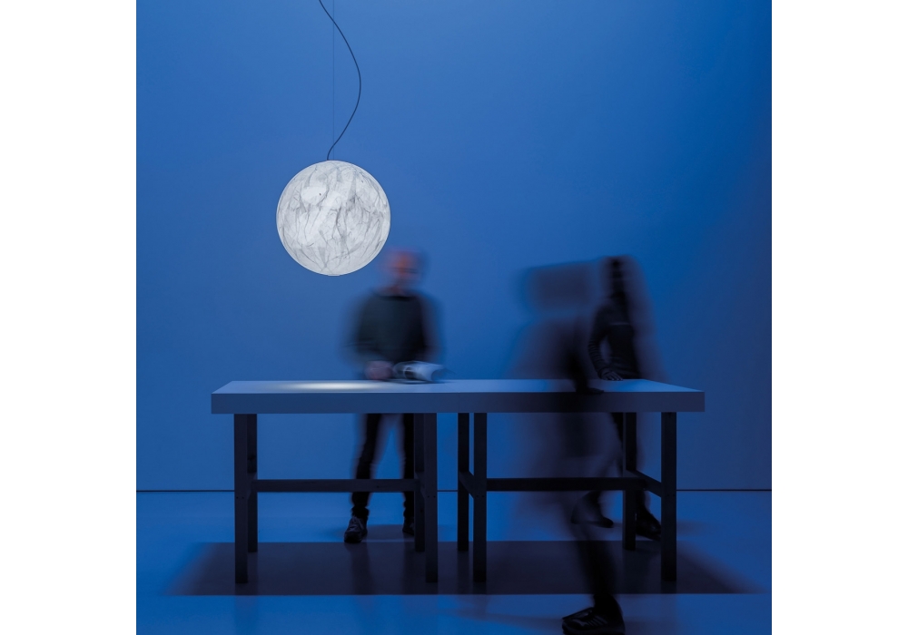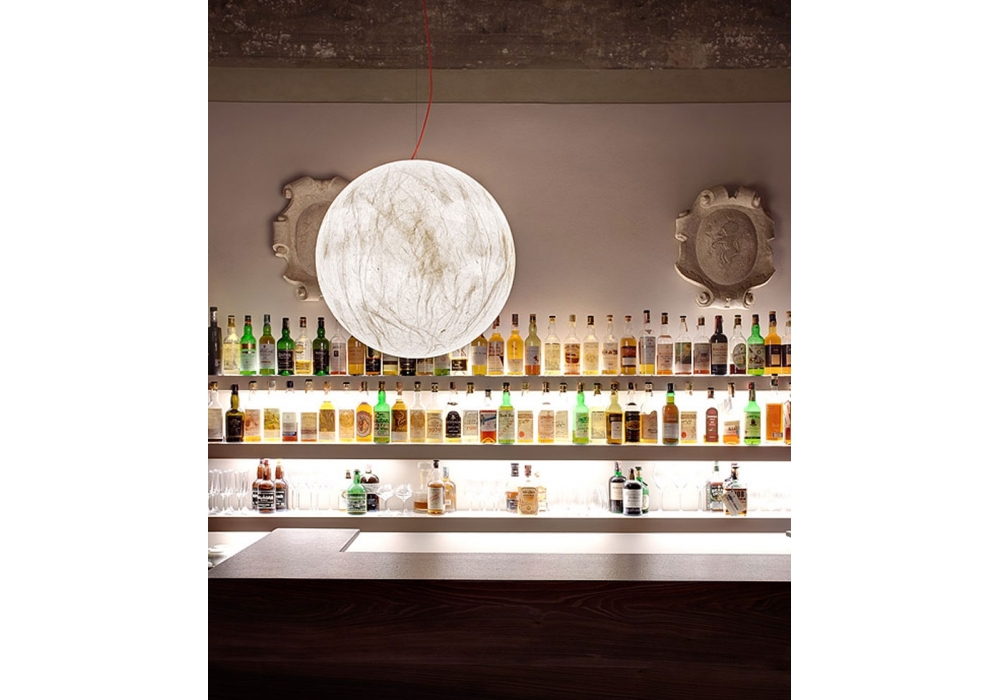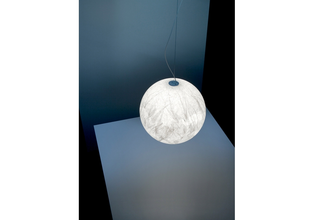 Moon conçue et produite par Davide Groppi est une lampe à suspension sphérique avec abat-jour en papier japonais et câble de suspension en acier inoxydable. La source lumineuse adoptée est avec un culot de type LED E27. Moon est disponible en différentes tailles.