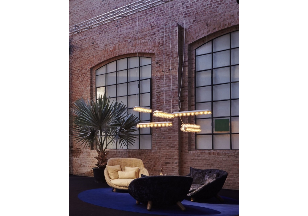Prop Light Double Horizontal conçue par Bertjan Pot pour Moooi est une lampe à suspension LED dimmable à éclairage direct. Structure en PMMA blanc. Câble transparent.