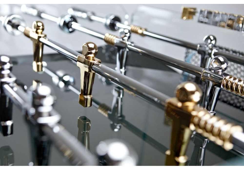 Cut to black again with the Cristallino (Calcio Balilla collection) by Adriano Design for Teckell. Cristallino GOLD LE is the perfect representation of the union between the elegance of gold and the precious perfection typical of Teckell. A foosball table embellished with exclusive 24 carat gold plated accessories, making Cristallino GOLD LE among the most coveted of the collection. This numbered and limited series is available in only 50 exemplars.